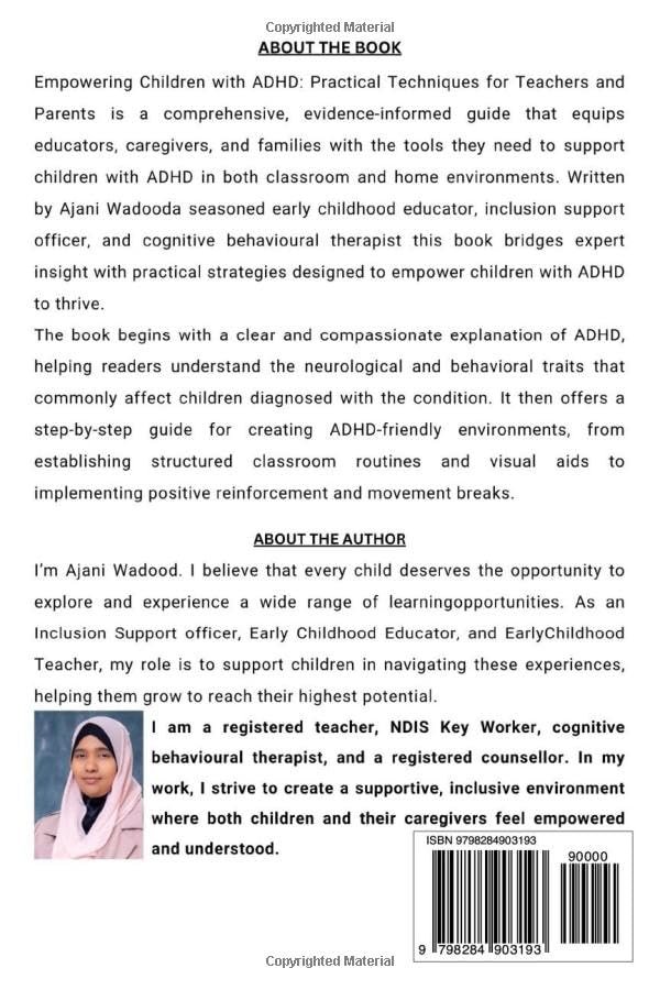 Empowering Children with ADHD: Practical Techniques for Teachers and Parents is a comprehensive, evidence-informed guide that equips educators, caregivers, and families with the tools they need to support children with ADHD in both classroom and home environments. Written by Ajani Wadooda seasoned early childhood educator, inclusion support officer, and cognitive behavioural therapist this book bridges expert insight with practical strategies designed to empower children with ADHD to thrive.